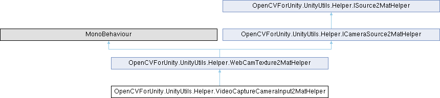 VideoCaptureCameraInput 2 mat helper. v 1.0.2 Depends on OpenCVForUnity version 2.6.1 (WebCamTexture2MatHelper v 1.0.1) or later. (Use the WebCamDevice.isFrontFacing and WebCamTexture.videoRotationAngle properties to flip the camera input image in VideoCaptue to the correct orientation.) More...